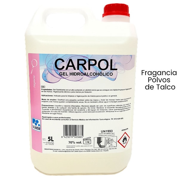 Continuamos con gel hidroalcoholico Carpol. Formulado para la desinfección de manos sin necesidad de aclarado posterior. Agradable perfume a talco. Contenido en alcohol 70%. Consigue una rápida limpieza e higienización de las manos por frotación. Fragancia a polvos de talco. No es pegajoso. Garrafa 5 litros.
